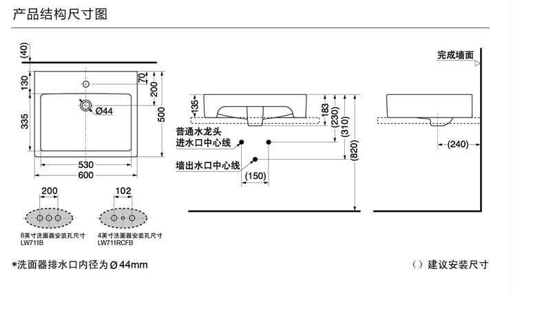 1、在選購面盆時應有所側重:面盆太淺,會水花四濺;面盆太深,恐使用不便;臺盆的臺面長度須大于75厘米,寬度須大于50厘米,無論從安全及視覺考慮,效果更好。半嵌盆不占用太大的衛生空間,但所裝臺盆的臺面外沿相距對面可占用之直線距離不得少于70厘米。臺下盆價格便宜、清洗方便,但在安裝及維修上不方便,底部必須安裝支撐架并固定與墻上,且拆裝復雜 ;安裝掛盆墻體必須是承重墻,否則墻體厚度必須在10厘米以上。