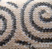 6.藏毯:藏毯打結法是在一個栽絨結里具備一個重疊的打結圈的栽絨結,即手工連環結,俗稱“重疊連環扣”,其打結程序可歸納為“挽頭兒割絨”,即將絨紗同時纏繞在經線和編織桿上,連續操作,挽到一定長度才割絨一次,割絨同時抽出編織桿,比傳統的“8”字扣的每頭兒必砍,明顯減少勞動強度,提高勞動效率。地毯的厚度由鐵桿的直徑決定,因此毯子厚薄控制自如。因藏毯打結法的特點,毯面可割絨,也可圈絨,可以滿足不同風格要求。用藏毯打結法織出的地毯,毯面形成自然橫向條紋,看上去重重疊疊,層次分明;毯背疙瘩有致。
