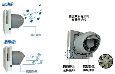 2、當安裝換氣扇的地方裝有天花板,且天花板上方預留裝有排往室外的管道時,應該選用管道式換氣扇,利用其較高的風壓往外排氣。