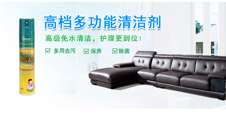 格瑞衛康皮革護理蠟 產品特效:強效去污、抗靜電、殺菌、防霉、去異味 產品材質:天然植物提取、100%養護成分,中性無磷,無摩擦劑 適用范圍: 適用于各種真皮制品。外觀參數材質:罐裝霧化產品產品清單:380ML罐裝霧化產品。 使用方法:先將本品搖勻,按下噴嘴向四周環境噴射數秒。