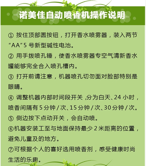 獨有功能:這款機器有一個獨特的設計:機器側面有一個白色的圓形按鈕,那個不是裝飾性的哦,這個可以按的,手動按一下,就會噴香水出來了,設計的原意是這樣的:很多時候您可能不需要設定幾分鐘噴一次,可能您只需要在用完洗手間后噴一次就可以了,這樣您就可以不用設置定時噴,只需要按一下那個白色的按鈕就可以,其他賣家的機器是沒有這個功能的,其他機器你想讓它噴香,你只能設置定時噴,達不到即時噴的功能。 能夠驅蚊驅蟲、凈化空氣、消除 異味、煙味、臭味、提高人們生活 和 工作空間 的空氣質量 的自動噴香清新空氣設備,同時具有殺菌、提神、安神、消除疲勞之功效! 適用場所:星級酒店、賓館、酒吧、KTV、娛樂場所、家庭、企事業單位衛生間、客廳、臥室、辦公室、影樓、spa會所、服裝店、鞋店、贈品、候車室、會議室、大廳、醫院、網吧等人口密集或需要增添清香的地方。