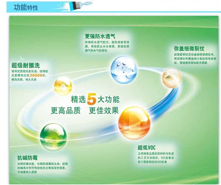 乳膠漆的功能十分重要,要根據涂刷的不同部位來選用乳膠漆,如臥室和客廳的墻面采用的乳膠漆要求附著力強,質感細膩,耐分化性和透氣性好;廚房、浴室的乳膠漆應具有防水、防霉、易洗刷的性能。臥室選用聚醋酸乙烯類的(一般稱乳膠漆)即可,但廚房、廁所和陽臺頂棚易受潮的部位,應選擇更耐擦洗的涂料,強乙丙或苯丙乳膠涂料