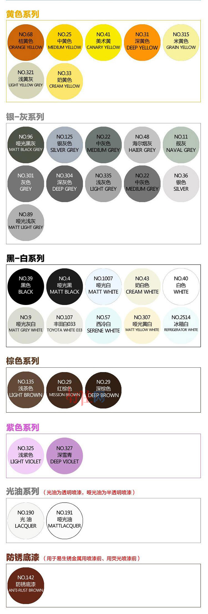 本品采用進口熱塑性丙烯酸樹脂及先進制漆技術制造;施工簡便、霧化優、漆膜豐滿、耐候性、硬度、柔韌性、耐沖擊、附著力強、色澤持久不變等綜合性能優。廣泛應用于金屬、木質、玻璃、皮制品、陶瓷、ABS塑膠等多種材質物體的噴涂、修補。