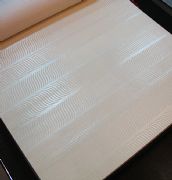 2.把最上面的一張墻紙左端拉至桌邊鋪平,右端任其從桌子另一邊垂下。