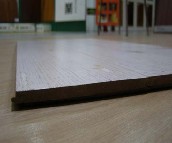 4、從外觀上看,表面呈溝面、麻面的是真,顯柔面的為假。正常強化木地板應是以高密度纖維板為基材,國際標準厚度為8mm,而假的是沒有耐磨層的三聚氰胺裝飾板。